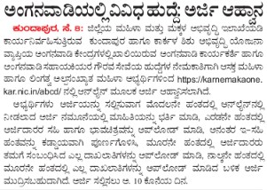 | ಹುದ್ಧೆಯ ಹೆಸರು | ಅಂಗನವಾಡಿ ಕಾರ್ಯಕರ್ತೆ ಮತ್ತು ಸಹಾಯಕಿ |