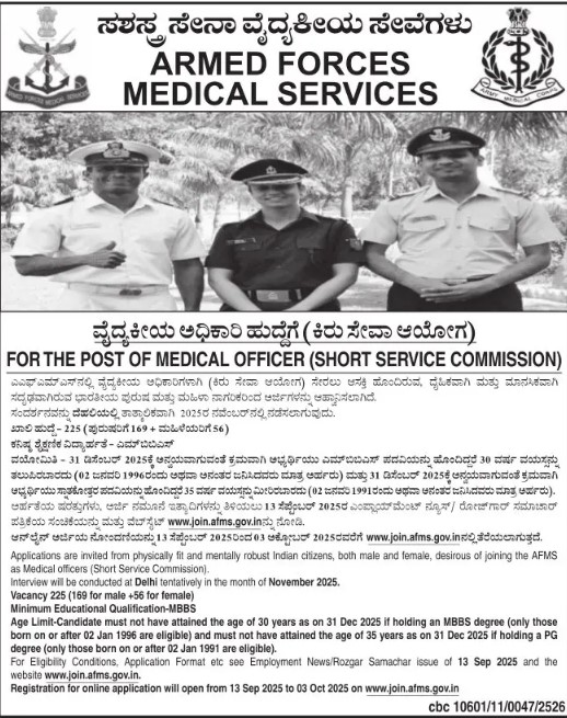 “ವೈದ್ಯಕೀಯ ಸೇವೆ, ದೇಶ ಸೇವೆಯೊಂದಿಗೆ!” — ಹೌದು, ಇದು ಕೇವಲ ಉದ್ಯೋಗವಲ್ಲ, ಇದು ಗೌರವದ ಕರೆಯಾಗಿದೆ. #ಸೇನಾ AFMS ನೇಮಕಾತಿ: ಪುರುಷ ಮತ್ತು ಮಹಿಳಾ ಅಭ್ಯರ್ಥಿಗಳಿಗೆ 225 ಸಶಸ್ತ್ರ ಸೇನೆಯ ವೈದ್ಯಕೀಯ ಹುದ್ದೆಗಳು# ಎಂಬ ಶೀರ್ಷಿಕೆಯಡಿ, Armed Forces Medical Services (AFMS) 2025 ನೇಮಕಾತಿಗೆ ಅರ್ಜಿ ಆಹ್ವಾನಿಸಲಾಗಿದೆ. ಈ ಹುದ್ದೆಗಳು Short Service Commission (SSC) ಮೂಲಕ ಭರ್ತಿ ಆಗಲಿದ್ದು, ದೆಹಲಿ ವಿಶ್ವವಿದ್ಯಾಲಯದಲ್ಲಿ ನವೆಂಬರ್ 2025ರಲ್ಲಿ ಸಂದರ್ಶನ ನಡೆಯಲಿದೆ.